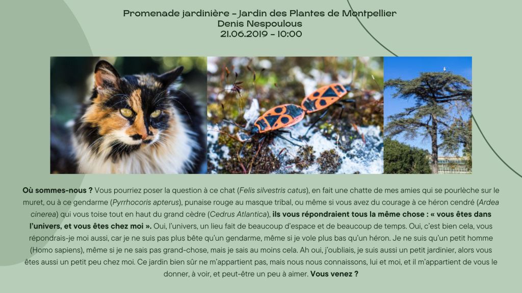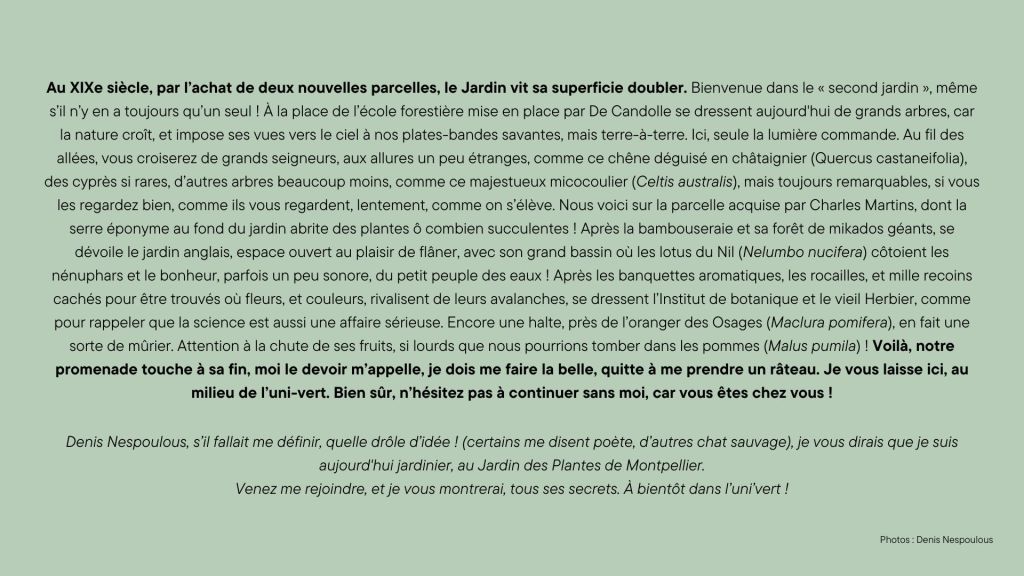 Partons en promenade dans le Jardin des Plantes avec Denis Nespoulous. Ce trés joli texte qui date de 2019 est aussi disponible sur le site des écologistes de l’Euzière ici.