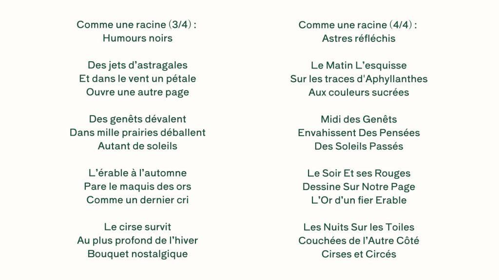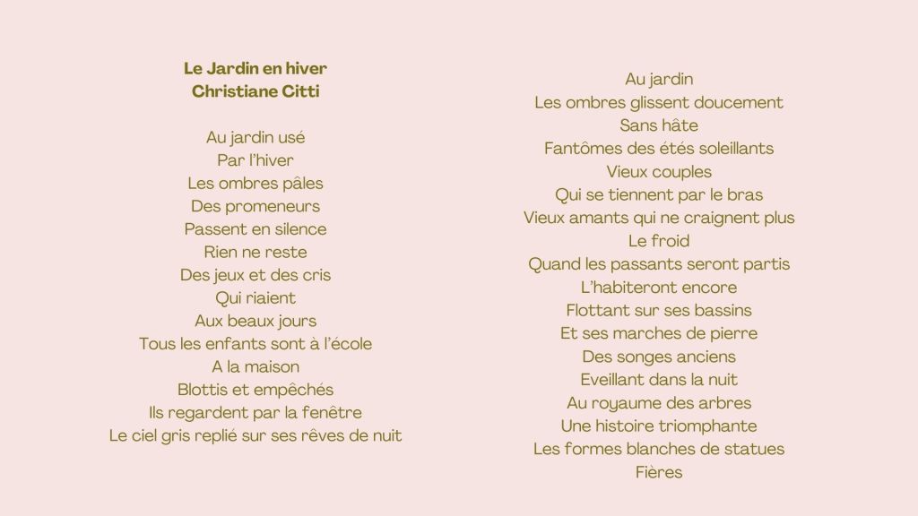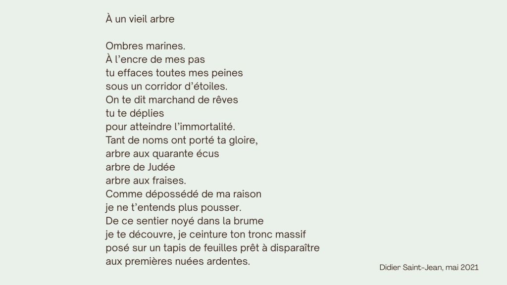 Didier Saint-Jean est jardinier, et est propriétaire du jardin de la Taillade qui, depuis sa création, est devenu un jardin romantique et botanique. Didier Saint-Jean a découvert la poésie au commencement d’un voyage intérieur il y a 18 ans. Il est membre de la Société des Poètes Français depuis 2020, et a publié dans les revues ‘Décharge’ et ‘Traction Brabant’ ainsi que dans des ‘Anthologies poétiques’ de Flammes Vives. Passionné de plantes et de vies animales, il aime découvrir en toutes saisons le Jardin des Plantes de Montpellier et nous offre ce poème.